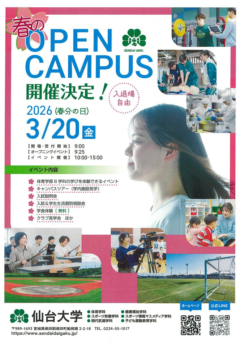 仙台大学では、3月20日(金・祝)にオープンキャンパスを開催します。