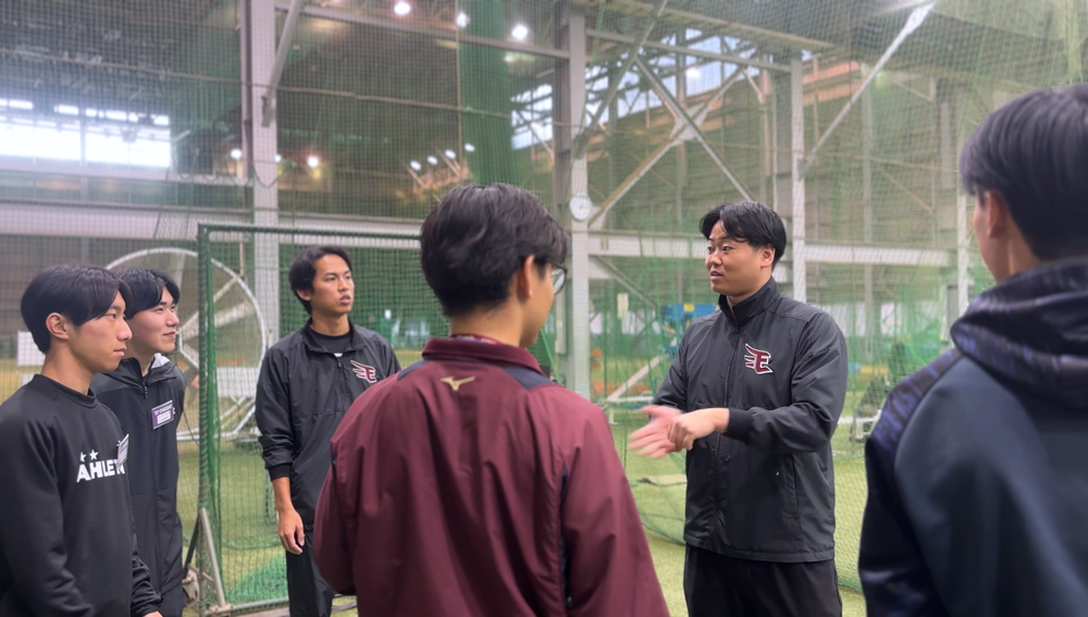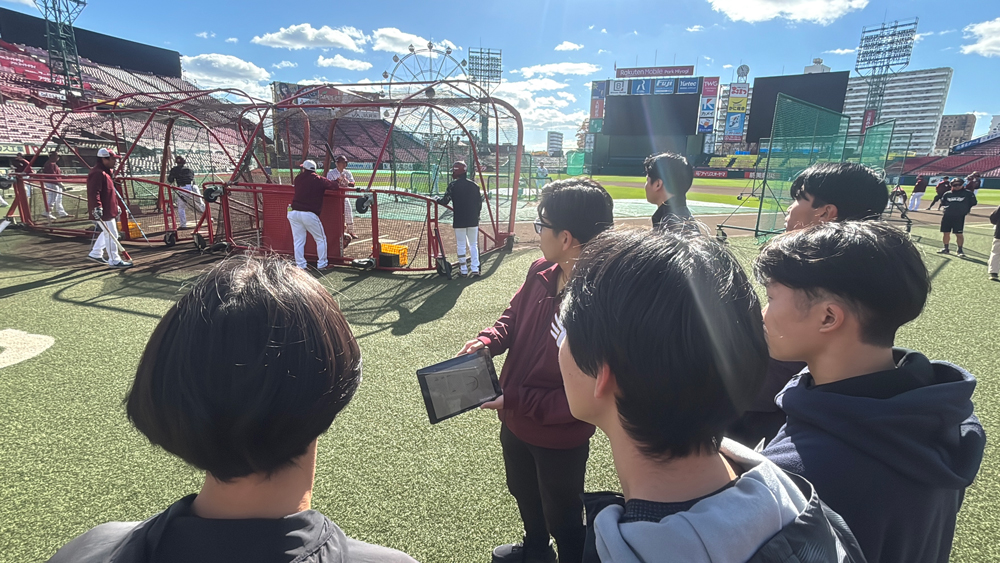 参加した学生は、楽天イーグルスの秋季練習(楽天モバイルパーク宮城)で仕事をするアナリストの方に同行し、活動の現場を見学・体験しました。実際に選手が練習中に取得しているデータの種類について説明を受け、見学終了後には、打撃練習の計測結果(打球速度や打球角度など)をまとめたデイリーレポートの作成プロセスについて学びました。プロ野球の現場で活躍するアナリストの仕事を間近で体感する、大変貴重な機会となりました。
