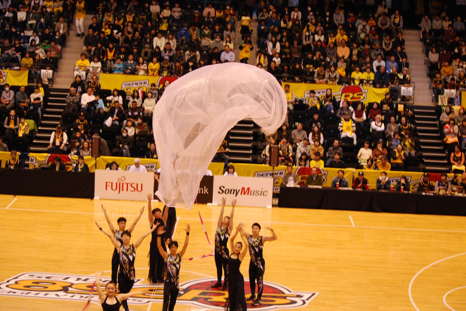 試合は、仙台89ERSチア・体育学科のKANAEさんによるTip Offセレモニーによってスタートし、ハーフタイムには、新体操競技部による美しい演技で観客を魅了しました。