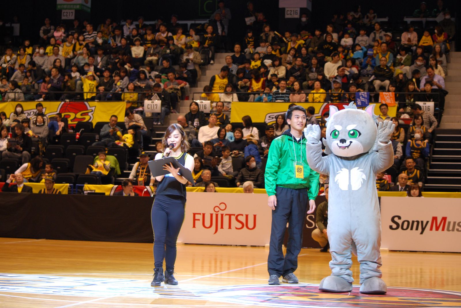 試合は1ゴールを争う白熱したゲームとなり、大きな歓声のなか仙台89ERSが74対72で勝利し、試合後に行われたMVP賞表彰では、運動栄養学科4年・新体操競技部の高橋葵さんがプレゼンターとなり、仙台89ERSの阿部潤選手に本学が様々な健康効果に関する実証研究を行っているアイリスオーヤマ社製の「体幹ストレッチコアトレーナー」がプレゼントされました。