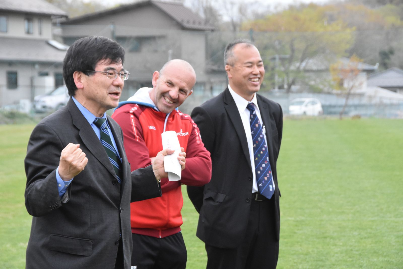 遠藤保雄学長は集まった学生に対し、「仙台大の皆さんを代表して心から歓迎します。日本では4~5年前まではラグビーの関心が少なかったのですが、ワールドカップで日本代表が南アフリカに勝利したことなど、大衆も関心を持ち始めてきました。本学のラグビー場の芝はしっかりと管理されておりますので今日の合同トレーニングを是非、有意義な時間にしてください。」とフランス語を交えながら英語で歓迎しました。