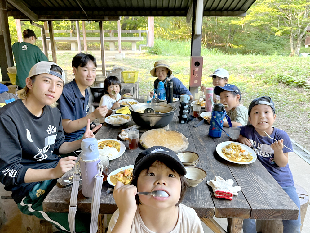 1泊2日ならではの本格的な野外炊事でカレーライス作りに挑戦!学生たちは包丁の使い方や火の扱いを丁寧に指導しながら、子どもたちと一緒に協力して美味しい夕食を作り上げました。