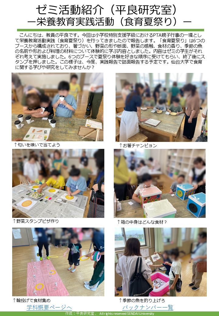 今回のスポーツ栄養学科通信は、「ゼミ活動紹介(平良研究室) ー栄養教育実践活動(食育夏祭り)ー」です。
