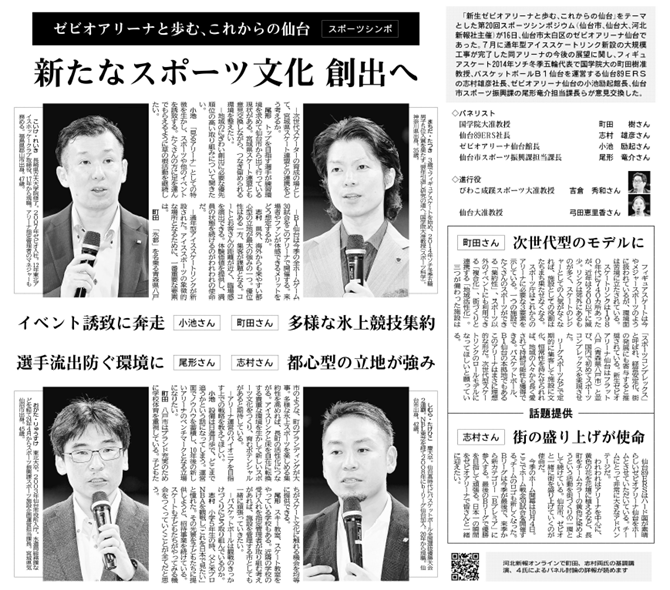 9月16日(火)、仙台市太白区のゼビオアリーナ仙台にて、「新生ゼビオアリーナと歩む、これからの仙台」をテーマとした「第20回スポーツシンポジウム」が、仙台市・河北新報社・仙台大学の主催で開催されました。