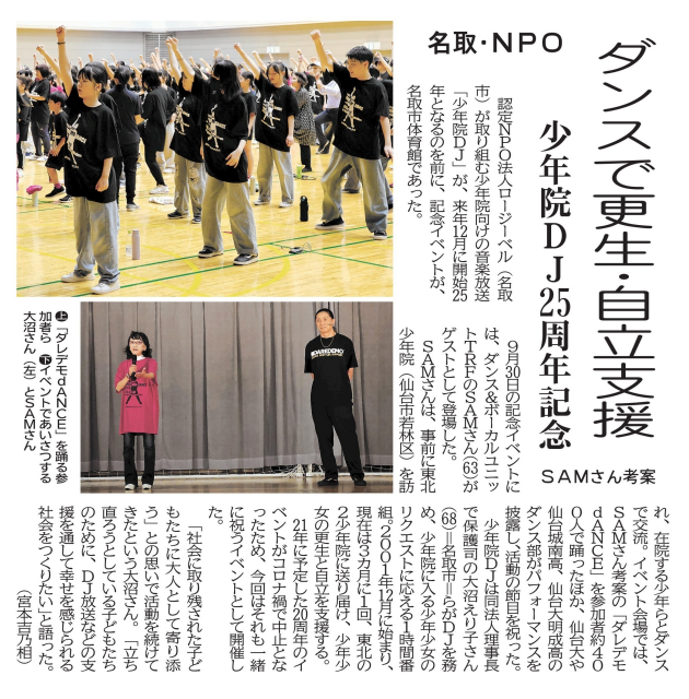 9月30日(火)、認定NPO法人ロージーベル(名取市)が取り組む少年院向けの音楽放送「少年院DJ」が、来年12月に開始25年となるのを前に、記念イベントが名取市体育館で行われました。本学及び仙台大明成高のダンス部がパフォーマンスを披露しました。