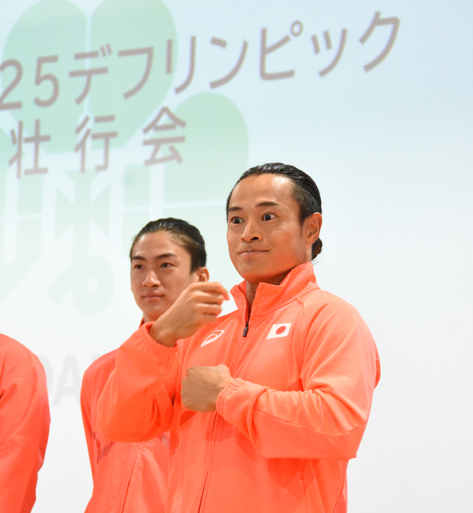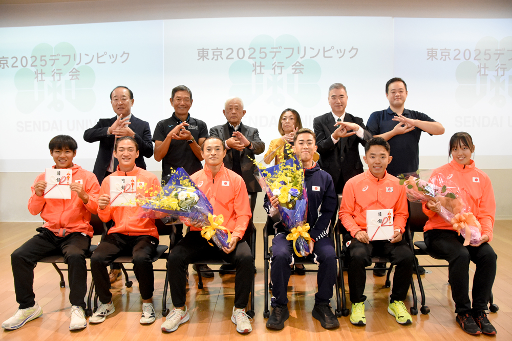 選手を代表してあいさつした、陸上競技100mなどに出場する本学職員の佐々木琢磨選手は、「仙台大学関係者6名がデフリンピックに出場できることをうれしく思います。大会に臨めるのは、多くの方々のご理解とご協力のおかげです。絶対に世界一を取って仙台大学に戻ってきます」と手話で力強く決意を語りました。