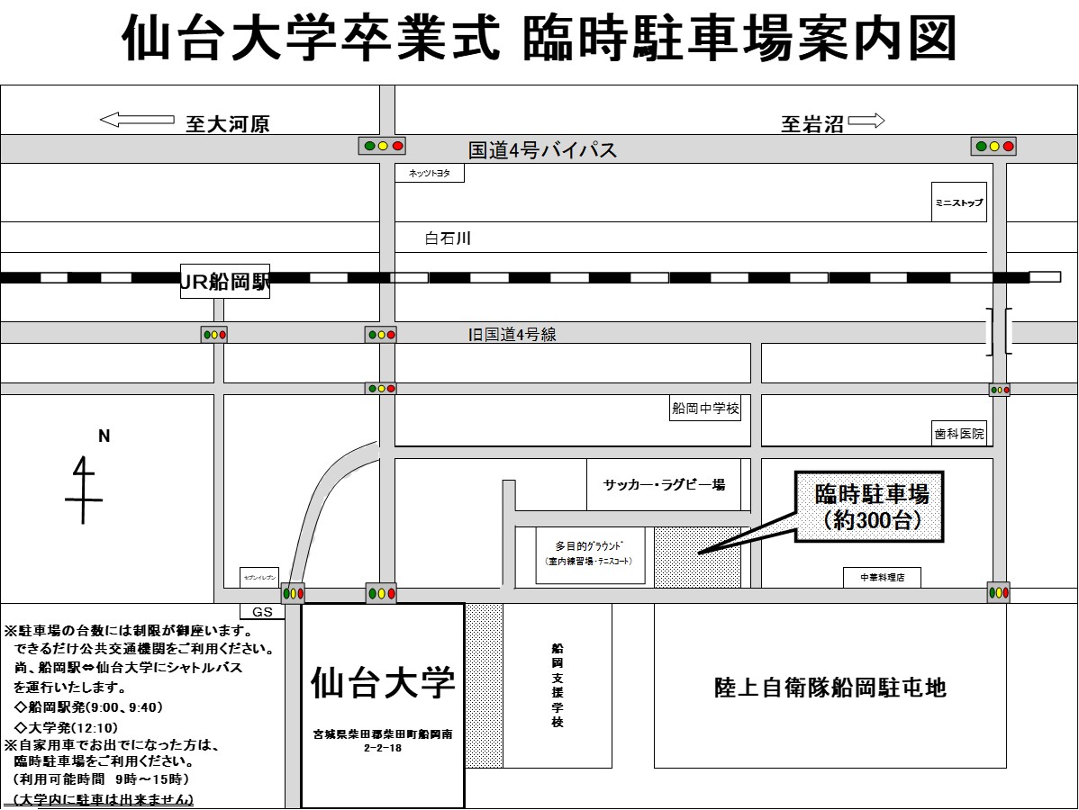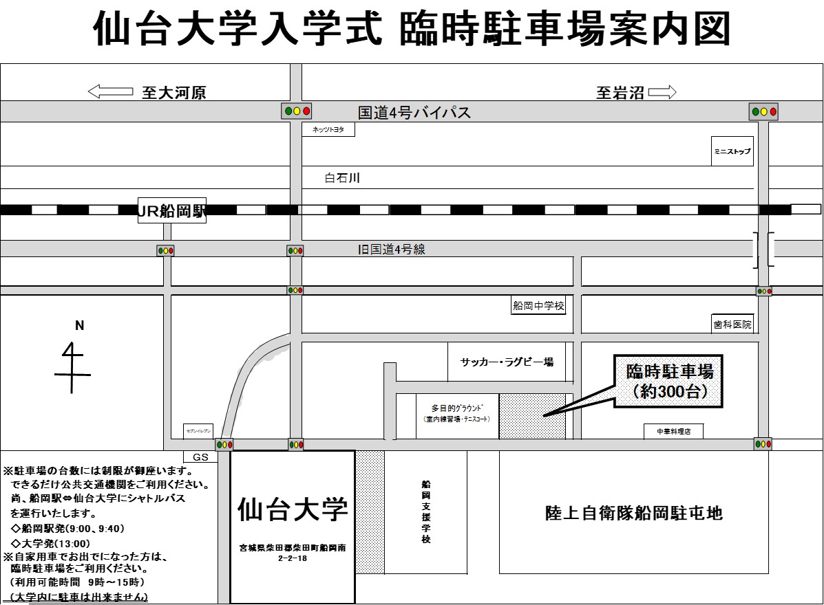 台数に制限がございますので、できるだけ公共交通機関をご利用いただきますようお願いいたします。なお、船岡駅⇔仙台大学にシャトルバスを運行いたしますのでご利用ください。