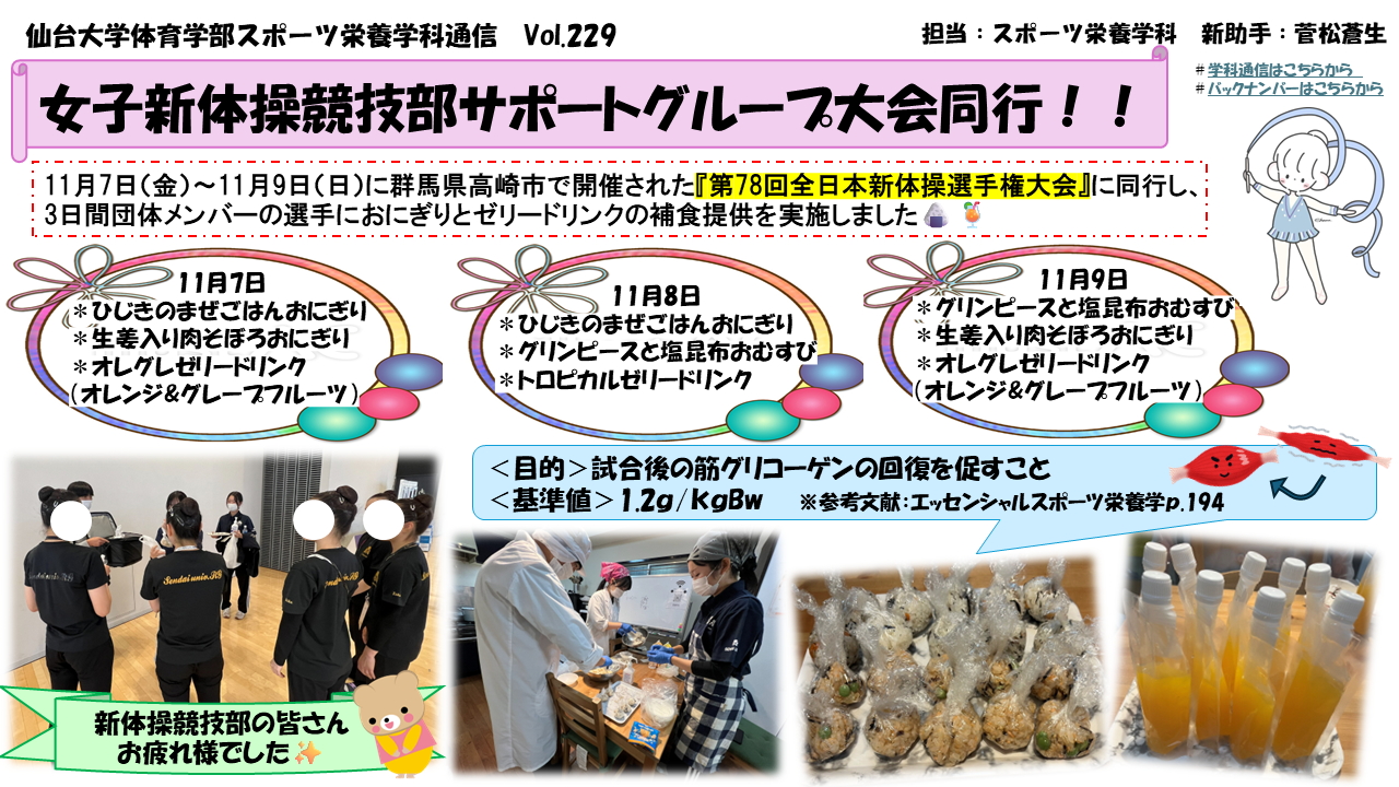 今回のスポーツ栄養学科通信は、「女子新体操競技部サポートグループ大会同行」です。