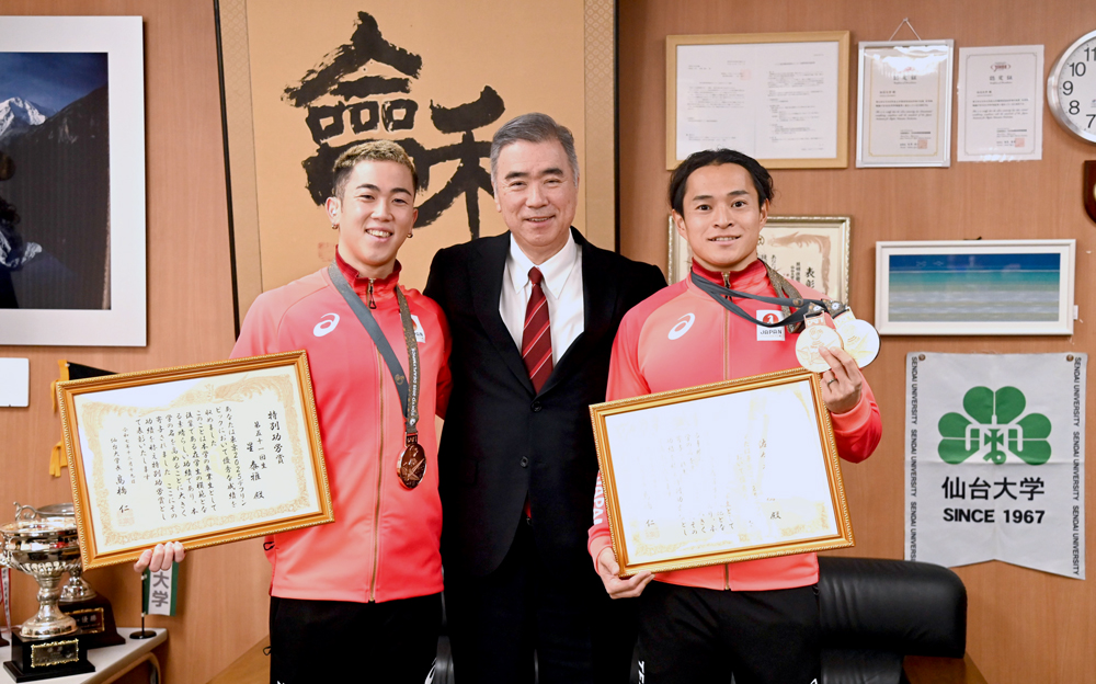 本学卒業生の佐々木琢磨氏・星泰雅氏に「仙台大学特別功労賞」を贈呈