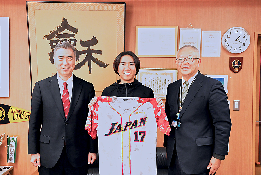 星流空斗(ほし・りくと)さん(体育学科4年―福島・聖光学院高校出身)が、大学軟式野球日本代表に選出され、第28回全日本大学軟式野球国際親善大会に出場しました。12月19日に髙橋仁学長を訪問し、大会結果及び代表活動について報告しました。