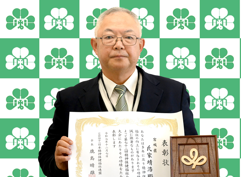 本学の氏家靖浩(うじいえ・やすひろ)教授が、精神保健福祉分野における長年の功績が認められ、「日本精神保健福祉連盟会長表彰」および「精神保健福祉功労者 宮城県知事表彰」を受賞しました。