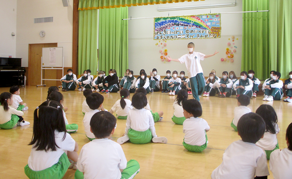 はじめに行われた集会では、学生によるブレイクダンスやピアノ演奏が披露され、子どもたちは目を輝かせながら鑑賞し、「ダンスかっこいい!」「ピアノのお姉さんすごい!」といった声があがるなど、大きな歓声に包まれました。
