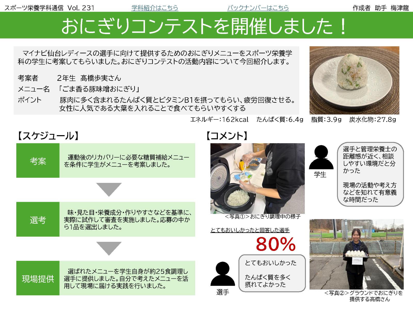 今回のスポーツ栄養学科通信は、「【プロ現場レポ】選手に届け!私が考えた本気のおにぎりレシピ」です。