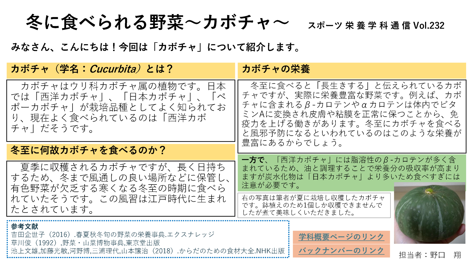 今回のスポーツ栄養学科通信は、「冬に食べられる野菜~カボチャ~」です。