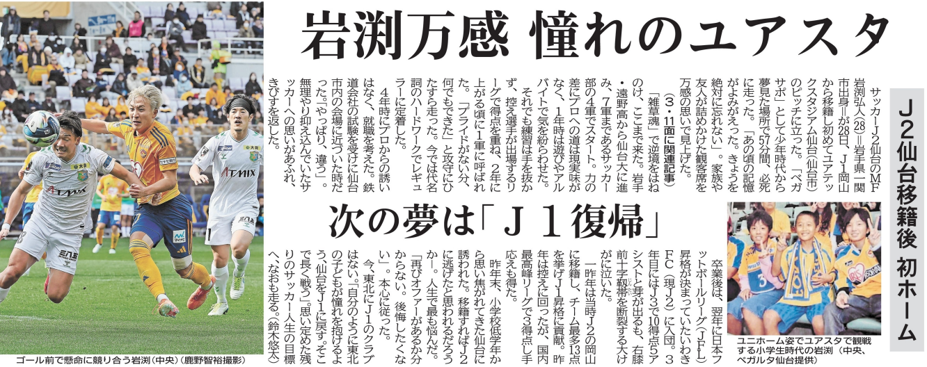 サッカーJ2仙台のMF岩渕弘人(仙台大卒)が2月28日、J1岡山から移籍し初めてユアテックスタジアム仙台(仙台市)のピッチに立ちました。「ベガサポ」として少年時代から夢見た場所で57分間、必死に走り続けました。「あの頃の記憶がよみがえった。きょうを絶対に忘れない」。家族や友人が詰めかけた観客席を万感の思いで見上げ、感謝と決意を胸に刻みました。