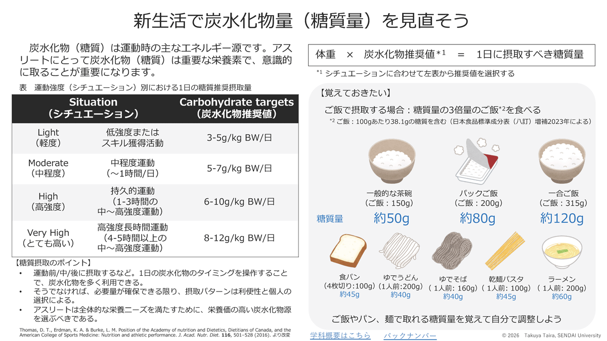 今回のスポーツ栄養学科通信は、「新生活で炭水化物量(糖質量)を見直そう」です。