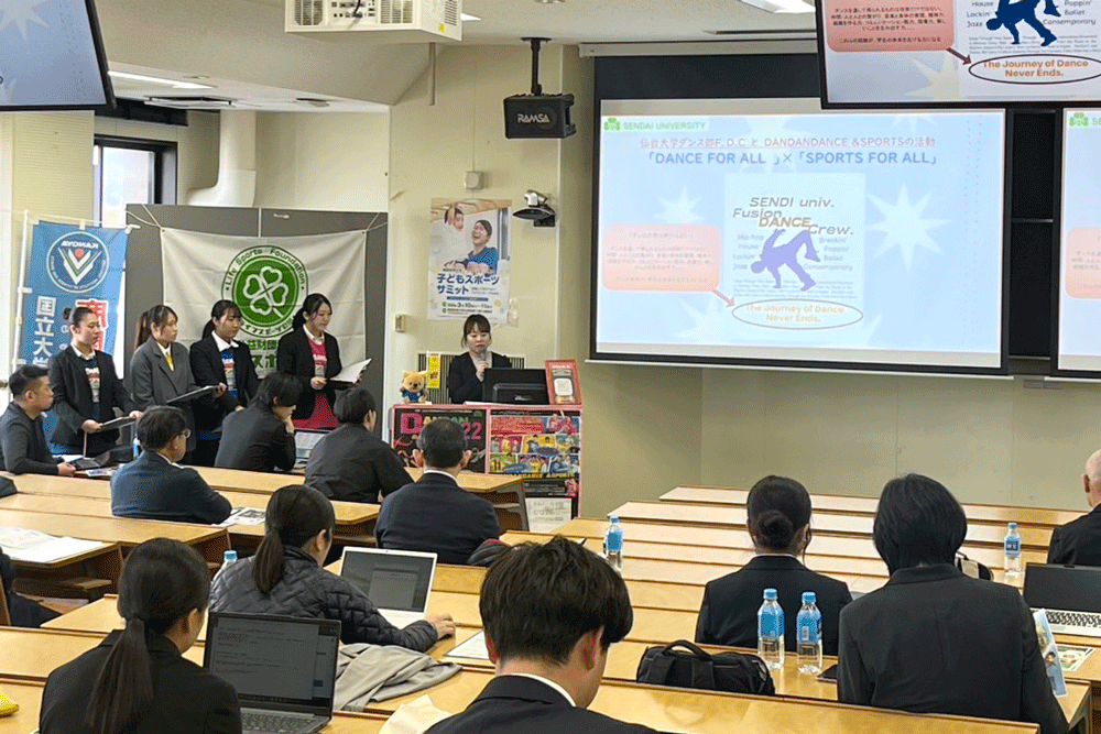 本サミットでは、第22回DANDANDANCE&SPORTSの活動について報告を行いました。「SPORTS FOR ALL, DANCE FOR ALL」を掲げ、地域との関わりについて教員が発表し、学生はこれまでの活動内容や、ダンスを通して子どもたちとつながり、その楽しさを伝える取り組みについて紹介しました。