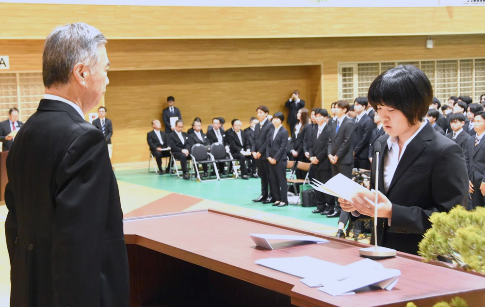 新入生を代表し、体育学科1年の町井心結さん(北海道・滝川高校出身)が、「私たちは、体育・スポーツや健康に関わる諸科学を探究し、これからの時代を担う人材となるべく、身体を鍛え、教養を深め、心を磨き、充実した学生生活を送るよう努めてまいります」と力強く宣誓しました。