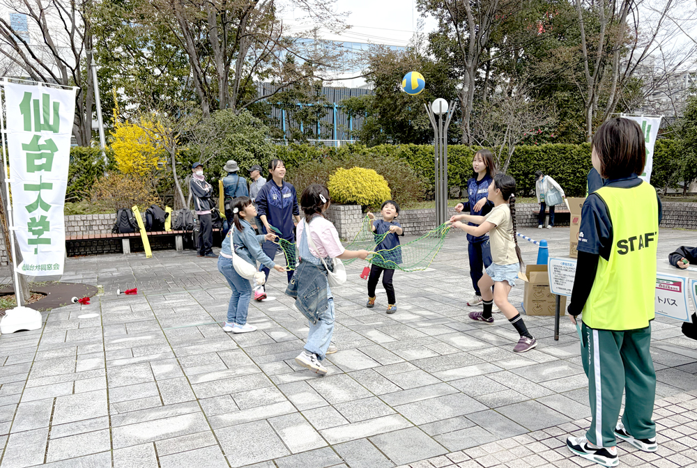 本ブースは、宮田先生およびゼミ生4名、明成高校女子サッカー部35名が連携して運営しました。仙台大学ブースでは、バッコーやラダーゲッター、ネットパス、ディスクゴルフなどのニュースポーツ体験を実施し、明成高校ブースではキックダーツやダッシュ・ザ・バトルを展開しました。いずれも子どもから大人まで楽しめる内容となり、親子で参加する姿が多く見られました。