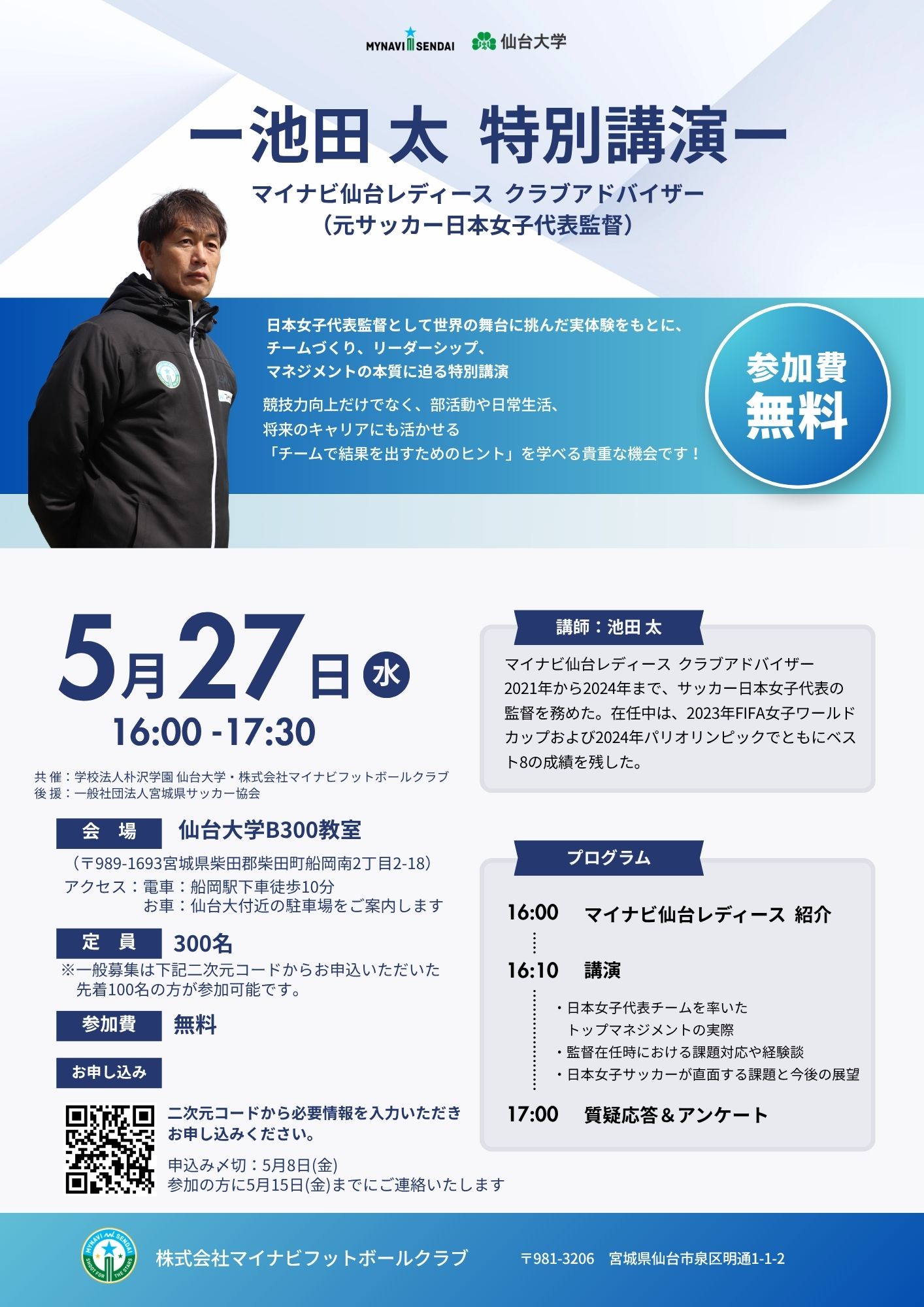 講師には、2021年から2024年までサッカー日本女子代表監督を務められた池田太氏(現・マイナビ仙台レディース クラブアドバイザー)をお招きし、「チームづくり」「リーダーシップ」「マネジメント」「チーム結果を出すためのヒント」をテーマにご講演いただきます。