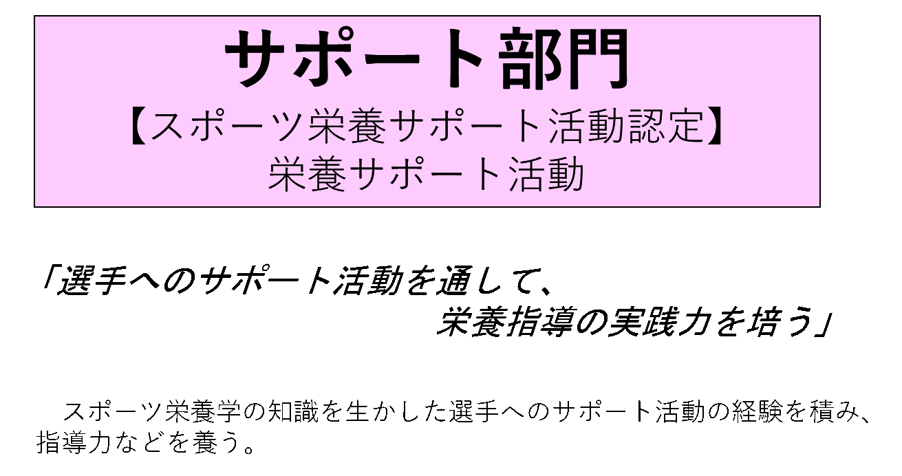 サポート部門は、本学運動部に対して、運動栄養学科の学生が栄養サポート活動を行って競技力向上に貢献するとともに、スポーツや健康増進の現場で活躍するために役立つ実践経験を積むことを目的に活動しています。※各部をクリックすると、年間スケジュールを確認することができます